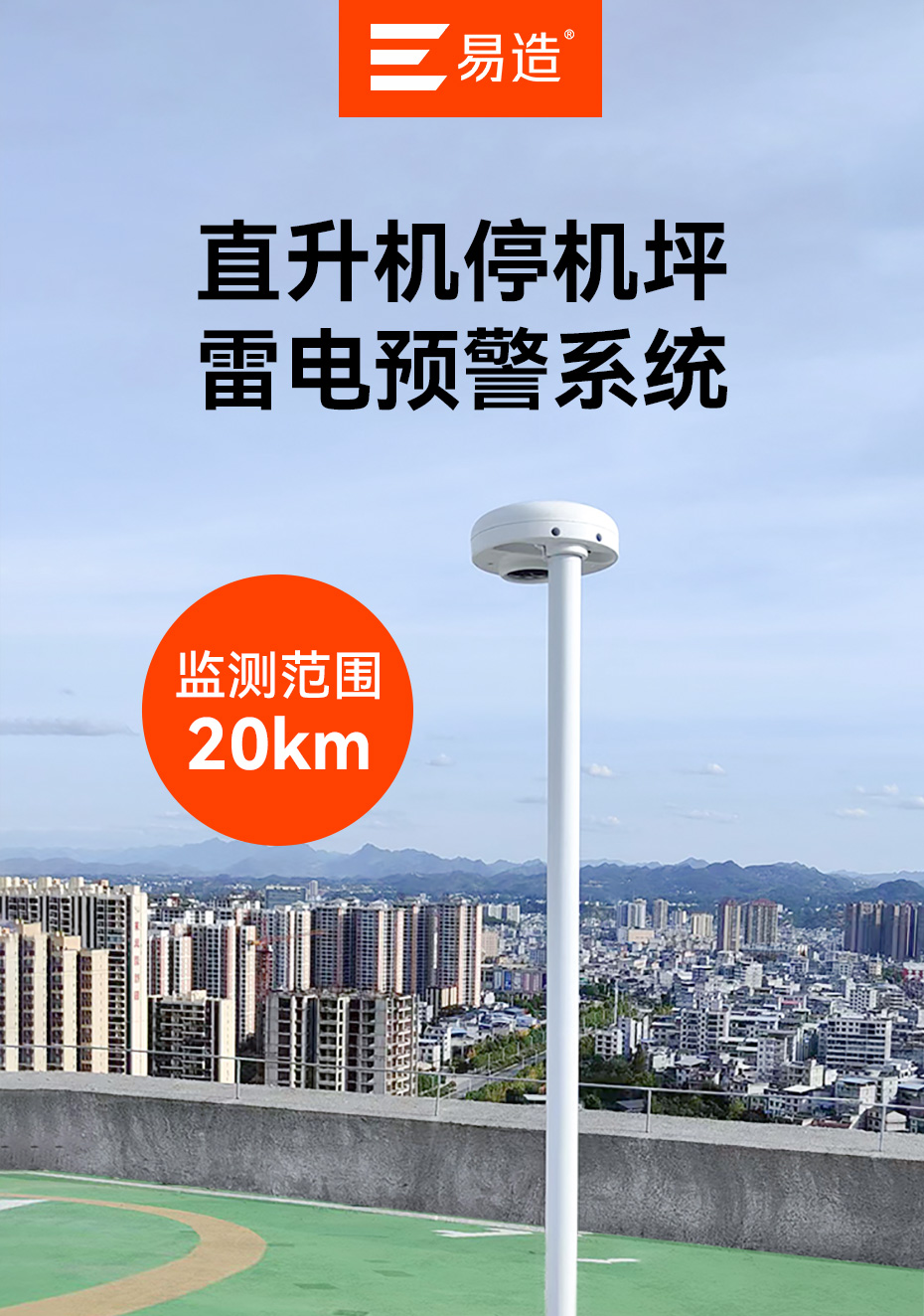 易造場磨式雷電預警系統,采用新一代雙算法預警技術,預警準確無漏報,具備良好的抗干擾和耐惡劣環境能力,為停機坪的主動防雷提供持續、準確的雷電預警服務,適用于高層建筑停機坪、醫院停機坪、機場、航空航天等領域。