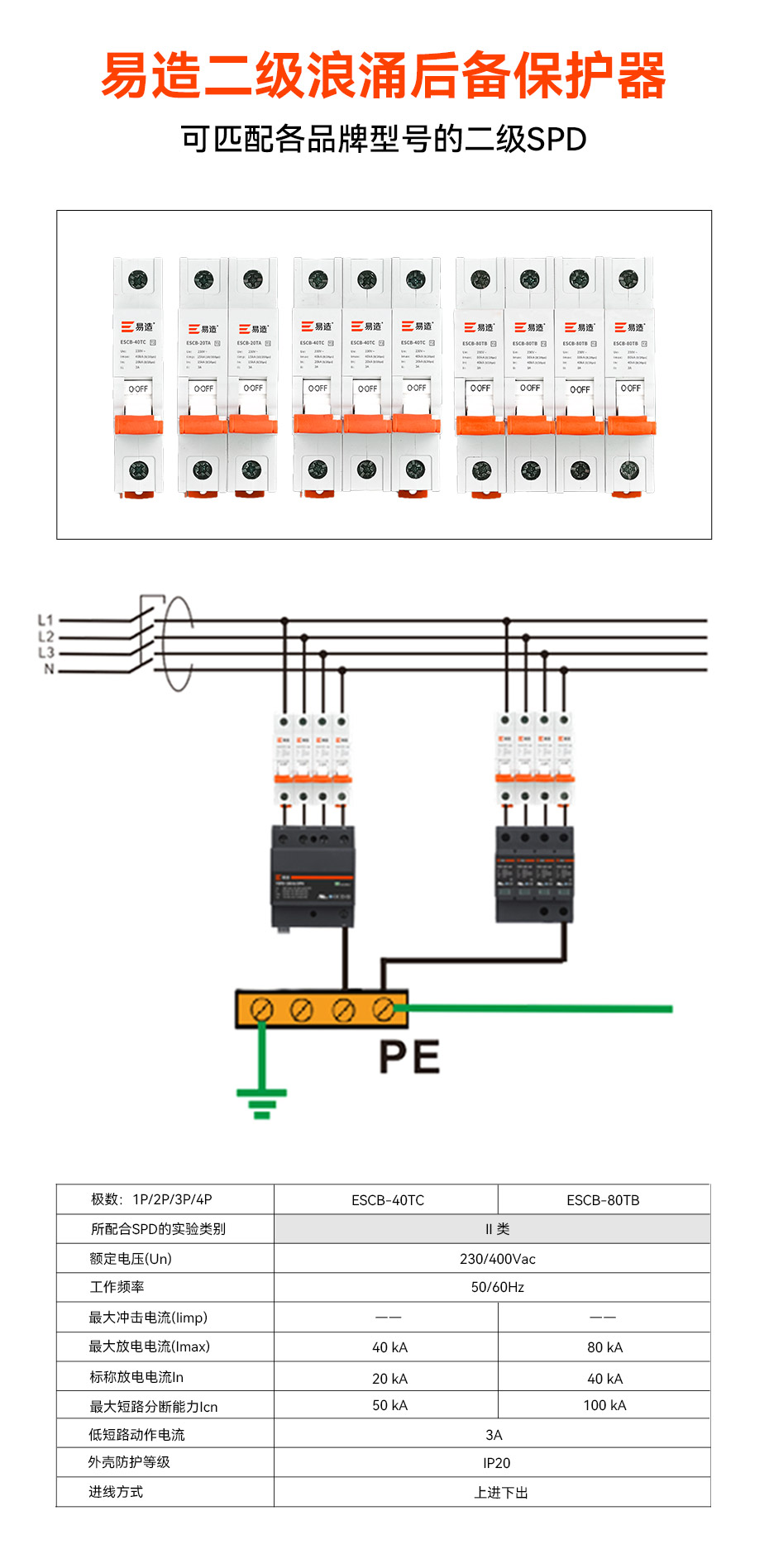 ESCB-80TB/40TC防雷后備浪涌保護器依據IEC和GB標準設計,采用主回路脫扣技術,通常用于保護Imax為80KA的浪涌保護器,可切斷100KA的短路電流,并且可在極短時間內切斷3A以上的低短路電流,具有高短路分斷,低短路瞬動,電涌耐受能力高,殘壓低,尺寸小,可監控等優點,廣泛運用于配電柜,配電箱,低壓柜上.