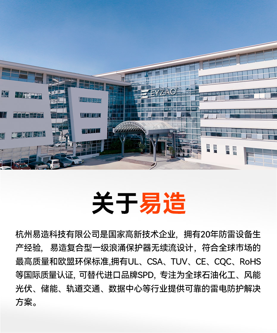 易造復合型一級浪涌保護器擁有UL、TUV、CE、CQC等國內國際質量認證,符合全球市場的最高安全和RoHS歐盟環保標準,可替代進口品牌SPD,支持外貿出口。